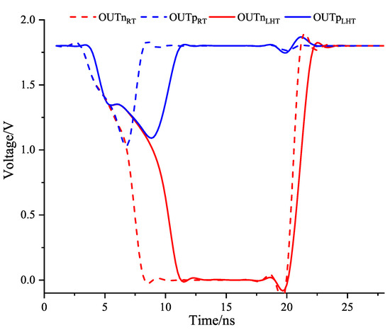 Moreover, the settling time of the preamplifier has been present in Equation (7) [28]. At cryogenic temperature, the threshold voltage of the used PMOS has increased by 26% and the has increased by 8.5%. Thus, the comparison time at LHT is longer than that at RT. The transient simulation results at 300 MHz clock of the comparator shown in Figure 9 indicate that the comparison time at LHT is 210 ps longer than that at RT. Therefore, the proposed dynamic comparator needs higher energy consumption to achieve the required performance at low temperature.