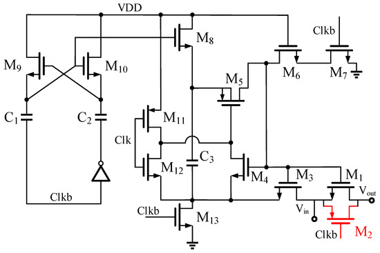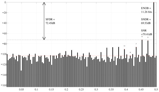 Figure 10 is the transistor-level circuit diagram of the proposed bootstrap switch. When Clk is low, the bootstrap capacitor C3 is charged to VDD by M8, and the gate of switch transistor M1 is pulled down to GND by M6 and M7, the sampling capacitors enter the hold state and M3, M5 turn off to cut off the passway between C3 and M1 at the same time [29,30]. As Clk goes high, M3 and M12 turn off, M8 and M9 turn on, C3 is connected to the source and gate of M1 which ensures that the of M1 equivalent to VDD is not affected by the change of input voltage. Meanwhile, M6 and M7 turn off, and the gate of M1 disconnects from GND. To keep the on-resistance of the sampling switch transistor constant, this circuit adds a PMOS M2 to compose a complementary switch. This structure can limit the change of the on-resistance. During the hold state, the electrons from the drain of NMOS and the holes from the source of PMOS will be canceled out. Consequently, the channel charge injection effect is suppressed to some extent. The dynamic performance of the proposed bootstrap switch with a 4 pF load is presented in Figure 11. The Nyquist-rate input post-layout simulation result shows an SNDR of 69.53 dB and an ENOB of 11.26 bits which far exceed the demand of an 8-bit SAR ADC.