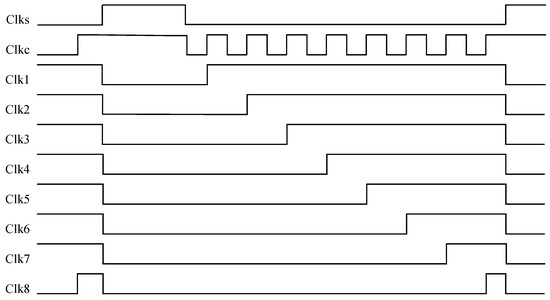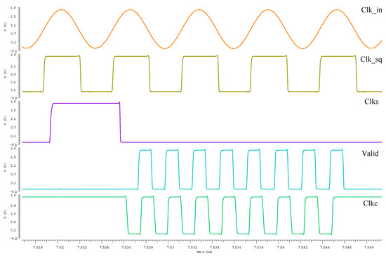 To avoid the introduction of high-frequency clock generation circuit, this paper adopts an asynchronous clock control logic to generate an internal clock. Different from the traditional timing generation circuit, this design uses the TSPC structure D flip-flop to obtain higher clock frequency, lower power consumption and a smaller layout area. Through simulation and comparison, with the same ADC performance, the power dissipation of SAR logic part using TSPC structure (906 W) is less than one-half of the DFF structure (1.9 mW) composed of NAND gate at LHT. Figure 12 shows the transistor-level circuit of the TSPC. Figure 13a and Figure 14 are schematic diagrams of the asynchronous clock generation circuit and timing diagram respectively. Wherein, Clks is the control clock of the bootstrap switch, which is obtained from the sinusoidal signal outside the chip through the waveform conversion circuit, and the duty cycle is 1:4. The output signals of the comparator and generate valid signals through an XOR gate. Clks, valid and Clk8 generate Clkc through a three inputs NOR gate. This apporach avoids the introduction of an additional high-frequency clock and the transmission attenuation of high frequency signals between RT and LHT.