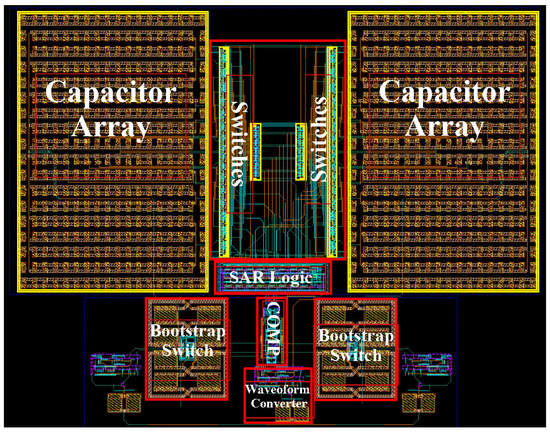 As shown in Figure 13b, Clk1 to Clk8 are used as the clock of the level conversion circuit of the capacitor array. On the rising edge of Clki, the of the comparator is sent to TSPC. If the is at high level, the corresponding capacitor is changed from to ground. When goes low, the associated capacitor is still linked to . At the falling edge of Clki, all capacitors are reconnected to . The inverter chain is used as a switch buffer to switch between and ground. This work uses metal–insulator–metal (MIM) capacitors and the capacitance of the unit capacitor is 16 fF (4 m × 4 m). The total capacitance of the two capacitor networks is about 8.2 pF. The total active area of the networks is 580 m × 310 m about 71% of the whole ADC. Figure 15 illustrates the layout of the entire cryogenic SAR ADC core.