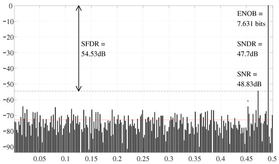 In Equation (A1), fs represented sampling frequency, Power was the power consumption of the SAR ADC, ERBW was the effective resolution bandwidth and the effective number of bits of the ADC was represented by ENOB.