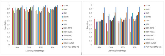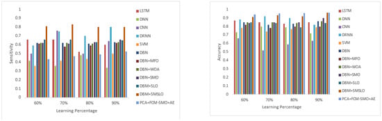 The values obtained in terms of the specificity and precision measures have been given in Figure 3, and the values obtained in terms of sensitivity and accuracy measures has been provided in Figure 4. The proposed technique (PCA + FCM-SMO + AE) has been compared with 11 existing techniques on all metrics with respect to different learning percentages ranging from 60 percent to 90 percent.