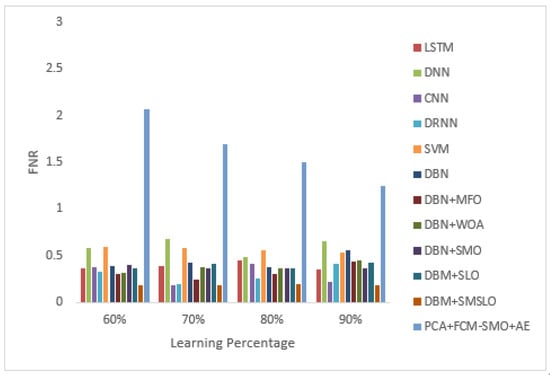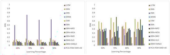The negative measures taken for the comparison are the false positive rate (FPR), false discovery rate (FDR) and false negative rate (FNR). Equations for each of the measures are provided as (18), (19) and (20), respectively. The values obtained on the comparison basis have been provided on the graph in Figure 5 (FPR and FDR) and Figure 6 (FNR).