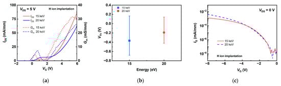 (a) Transfer characteristics; (b) average values and errors of threshold voltages; (c) gate leakage curves at the negative bias of p-GaN HEMTs with H ion implantation energies of 15 keV and 20 keV, without annealing.