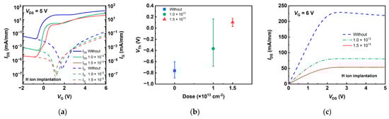 (a) Transfer characteristics in log scale; (b) average values and errors of threshold voltages; (c) output characteristics at VG = 6 V of p-GaN HEMTs without H ion implantation and with H ion implantation doses of 1.0 × 1013 cm−2 and 1.5 × 1013 cm−2, without annealing.
