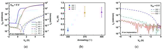 (a) Transfer characteristics at log scale; (b) average values and errors of threshold voltages; (c) gate leakage characteristics at the negative bias of p-GaN HEMTs obtained via H ion implantation, after annealing at 350, 375, and 400 °C.