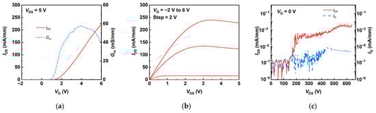 Finally, the p-GaN HEMT obtained via H ion implantation with energy of 15 keV and a dose of 1.5 × 1013 cm−2, after annealing at 400 °C, was measured. The on/off current ratio is ~106, as shown in Figure 4a. From the transfer curve in Figure 5a, it can be seen that the value of Gm is 57.7 mS/mm. The maximum drain current at VG = 6 V is 240.0 mA/mm, as shown in Figure 5b. Additionally, the on-resistance (RON) is calculated to be 8.4 Ω·mm. As shown in Figure 5c, the breakdown voltage is 642 V at VG = 0 V.