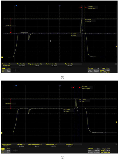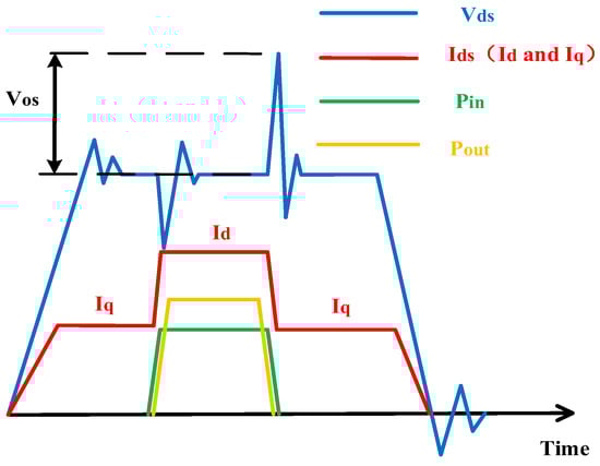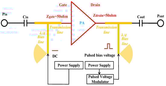 In the literature, power amplifiers may be classified into two types: CW (Continuous Microwave) power amplifiers and pulsed power amplifiers [1,2,3]. The power of the most recent X-band high-power pulsed power amplifiers has reached the kW level due to material advancement and structure optimization [4]. However, in order to reduce heat dissipation and ensure safety, high-power power amplifiers should operate in pulse mode [5]. To obtain more efficiency, greater output power, and higher gain, designers of high-power amplifiers often prefer employing drain modulation rather than gate modulation [6,7]. The microwave pulse is fully nested in the drain voltage pulse to ensure the quality of the microwave waveform when using drain bias modulation. According to the literature [8], as illustrated in Figure 1, the drain of the power amplifier will have a significant voltage overshoot, which might damage the device due to the sharp rising/falling edges of the pulse. This issue becomes worse with an increased output power.