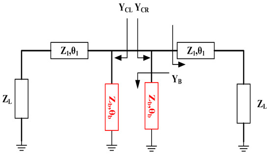 Assume that the proposed bias circuit is symmetric and that the microwave’s ideal short-circuit location is the radial stub. The impedance transformation relation of the proposed bias circuit is shown in Figure 4. The load ZL has a 50 Ω impedance. Z1 is the transmission line’s characteristic impedance, Zb is twice that of the bias line’s characteristic impedance, θb is the bias line’s electrical length, and θ1 is the transmission line’s electrical length.