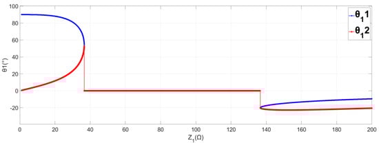 Figure 5 illustrates the relationship between Z1 and θ1 when Zb is set to 200 Ω and θb to 30°. Figure 5 shows that θ11 and θ12 are positive when Z1 is less than 36.6 Ω and negative when Z1 is more than 136.6 Ω. Thus, (7) is required for θ1 to have at least one solution, as it only makes physical sense if θ11 and θ12 are positive. Furthermore, the shorter θ12 should be employed to minimize the transmission line’s parasitic inductance.