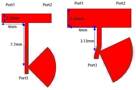 The 8.5 GHz center frequency is established. For the proposed bias circuit, Zb was set to 200 Ω and θb to 30°, after which the initial values of Z1 and θ1 were set to 36.6 Ω and 53.1°, respectively, according to (11) and (12). For the traditional bias circuit, Zb was set to 200 Ω and θb to 90°, and Z1 and θ1 were set to 50 Ω and 53.1°. The traditional and proposed bias circuits are optimized and simulated by ADS (Advanced Design Software). The simulation of the circuits was performed on a Rogers5880 substrate with a relative dielectric constant of 2.2, a thickness of 0.508 mm, and a metal layer thickness of 35 μm.