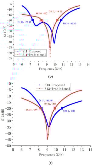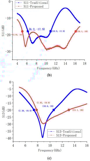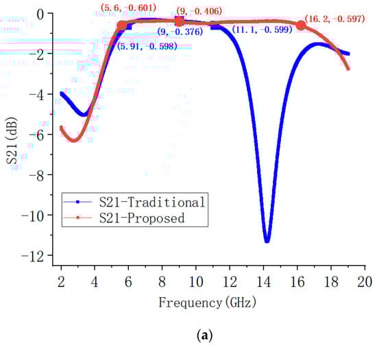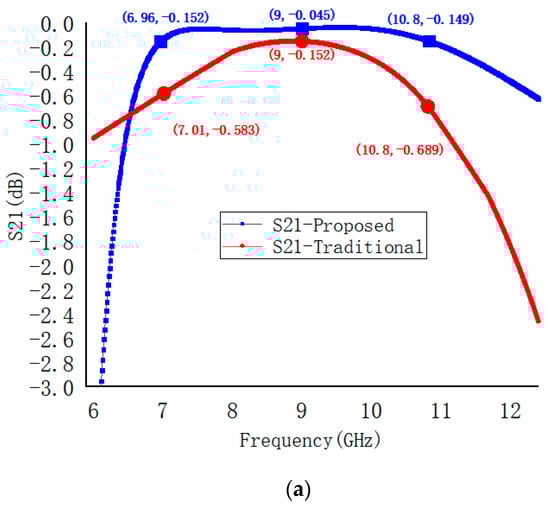 The results of the EM simulation for the S parameters of the proposed bias circuit and the traditional bias circuit are shown in Figure 8. Figure 8a is the transmission loss, Figure 8b is the reflection coefficient, Figure 8a is the isolation. The simulated return loss of port1 of the traditional bias circuit is less than −20 dB from 8.36 to 10.3 GHz, while the simulated return loss of port1 of the proposed bias circuit is less than −20 dB from 7.28 to 10.8 GHz. According to the simulation results, the proposed bias circuit’s bandwidth is broader than that of the traditional bias circuit.