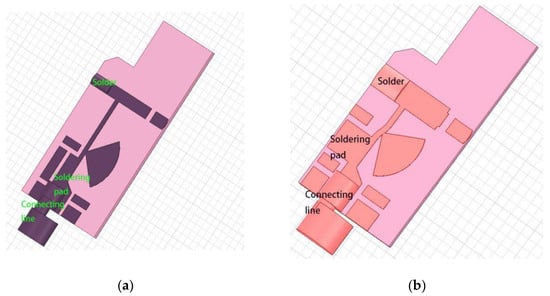The parasitic inductance of the traditional bias circuit and the proposed bias circuit is simulated by ANSYS. The simulation’s structural diagram is presented in Figure 9. Besides the bias circuit, the soldering pad of the stability circuit, the solder, and the connecting line between the bias circuit and the modulated power-supply circuit are also included to make the simulation results as realistic as possible.