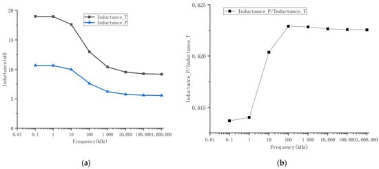 The parasitic inductance of the proposed and traditional bias circuits is illustrated in Figure 10a varying with frequency. Figure 10b illustrates the ratio of the parasitic inductance of the proposed bias circuit to that of the traditional bias circuit as a function of frequency. The abscissa of Figure 10a,b is logarithmic. The parasitic inductance of the proposed bias circuit is about 62% of that of the traditional bias circuit.