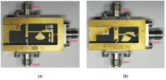 This section fabricated a proposed bias circuit and a traditional bias circuit to validate the proposed method. The layouts of the traditional bias circuit and the proposed bias circuit are shown in Figure 7. The circuits have been designed and implemented on a Rogers5880 substrate with a relative dielectric constant of 2.2, a thickness of 0.508 mm, and a metal layer thickness of 35 μm. As illustrated in Figure 11, the fabricated microstrip circuit was welded on the copper base, and the conversion between the microstrip and coaxial part was realized with the SMA joint.