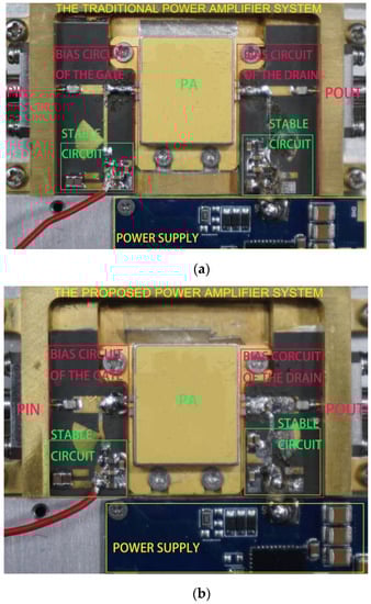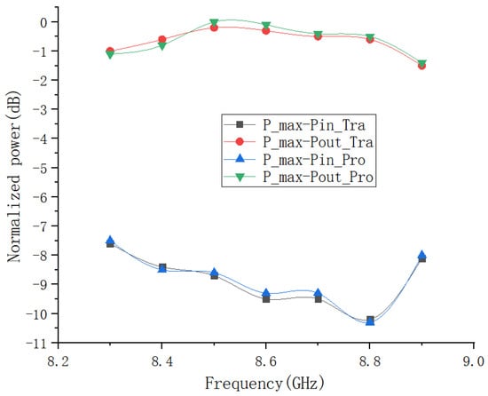 Both the traditional and proposed power-amplifier systems operate in class AB mode. The gate voltage of traditional and proposed power-amplifier systems is fixed at −1.8 V. The input and output power of the traditional and proposed power-amplifier systems was set to be basically the same. As shown in Figure 15, the input and output powers of the traditional and proposed power-amplifier systems are normalized to the difference from the maximum power P_max, which is the kW level.