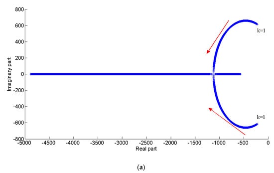 Considering the stability theory, the roots of Equation (30) should be in the left half plane. In Figure 3, changes in the characteristic equation roots are illustrated for different gains. It is observed that for , a stable range of the designed controller is obtained as .