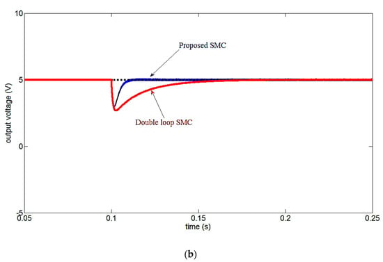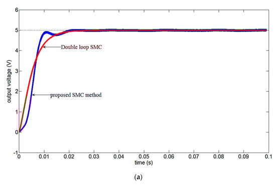 Considering the nominal parameters of the converter, responses of the proposed controller and standard double-loop SMC [18] are shown in Figure 8 for stepped changes of the output reference voltage. In this test, the reference voltage is stepped up from V to V. It is seen that the response of the proposed controller is stable in a wide range of output voltage changes and it has a superior dynamic response compared with standard double-loop SMC [18] in terms of response overshoot and settling time.