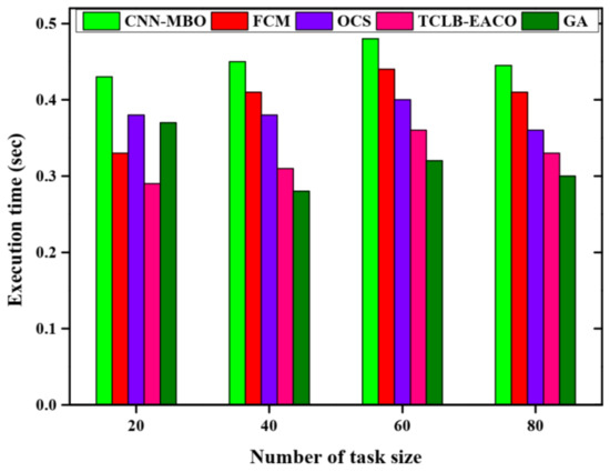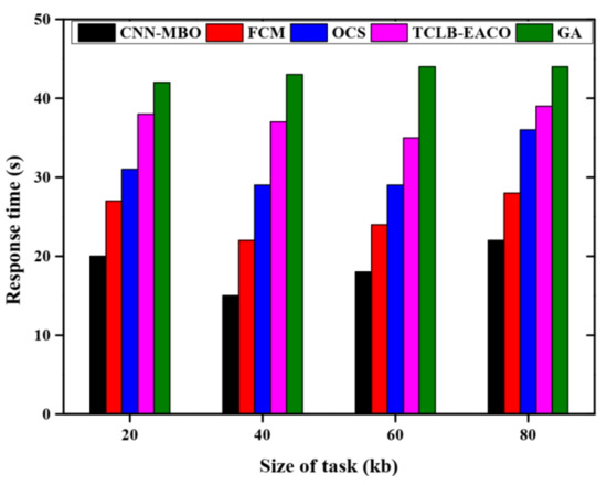 Figure 3 depicts the response time analysis with different task sizes. The proposed CNN-MBO model is compared with the fuzzy c-means learning (FCM) algorithm [18], the time, cost, and load balance-enhanced ant colony optimization (TCLB-EACO) algorithm, genetic algorithm (GA) [19], and optimized collaborative scheduling (OCS). The response time for a different number of task sizes is graphically represented. The proposed CNN-MBO model achieves a faster response time compared to other methods. For a low number of task sizes, the response time of the proposed CNN-MBO model is 20 s.
