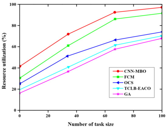 Figure 5 represents the resource utilization evaluation of various methods. The resource utilization rate of the proposed CNN-MBO model is compared with the resource utilization rate of FCM, TCLB-EACO, GA, and OCS. The resulting analysis shows that the proposed CNN-MBO model has a higher resource utilization rate compared to existing methods. As the number of task sizes increases, resource utilization gradually increases. The resource utilization rate of the proposed CNN-MBO model is about 98% for 100 task sizes.