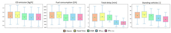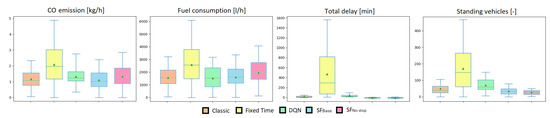 Figure 1. Each agent is given 1000 random episodes, and their performance is compared with the metrics of CO, fuel consumption, total delay, and standing vehicles. Each boxplot represents the average values based on 1000 random episodes that are identical. With the help of the boxplots, we can see the mean (green triangle) and the median (green line) of the data. Meanwhile, the boxes show points between the lower and upper quartiles (Q1–Q3), and the whiskers on top of the boxes are for the minimum and maximum ranges. The lower the values and the smaller the boxes are, the better.