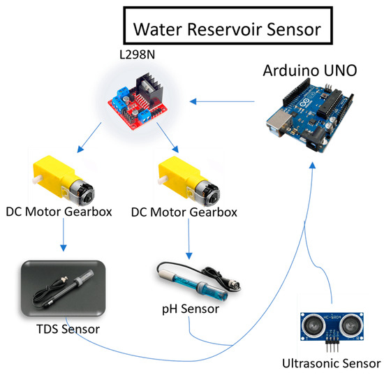 Arduino is also connected to Dual H-Bridge L298N which is used to control the movement of the DC motor gearbox in accordance with the pulse width modulation (PWM) input from Arduino. Then, the TDS sensor from DFRobot DFR0300 and pH sensor from DFRobot SEN0161 V2 are attached to the DC motor gearbox, and based on the PWM input from Arduino, the TDS sensor and pH sensor will be lowered to the determined height to start measuring the level of TDS and pH of the water reservoir. After the measurement is performed, Arduino will receive the measured TDS and pH data.