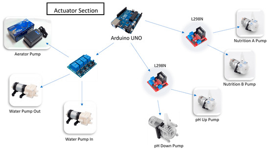 Arduino Uno also plays a critical role in the actuator section, serving as the control center for all existing actuators. As shown in Figure 4, there are two Dual H-Bridge L298N units connected to the Arduino, one to control the nutrient peristaltic pump and the other to control the pH peristaltic pump. The Dual H-Bridge L298N was chosen because it allows control of the actuators using PWM, enabling the precise control of the output of each peristaltic pump. Additionally, the Arduino is connected to a relay that is used to control three actuators: the water pump to add water to the reservoir, the water pump to reduce the water inside the reservoir, and the aerator to provide more oxygen into the system.