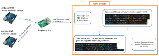 The Arduino on the water reservoir sensor section, nutrient control section, and actuator section are all connected to the Raspberry Pi 4 from the layer database and web, and this Raspberry acts as the brain of the entire system. The pH and TDS data on the Arduino sensor section are sent to Raspberry, then the pH and TDS data are processed by the fuzzy controller created by ANFIS, and the output is then sent to Arduino in the actuator section as shown in Figure 5. The output is a number in a form of seconds, which will determine how long each pump needs to be turned on in the actuator section. Raspberry will also send the output to the cloud database, then the web server will automatically detect that new data and reload the web component to show the latest data. This study also implements the internet of things, thus, the system can be controlled from anywhere. In order to accomplish everything described above, the Raspberry will work in multithreading by operating two applications at the same time. The first application is to control the system, while the other is to monitor the cloud database.