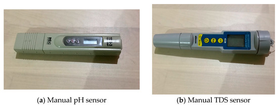 ANFIS is a combination of fuzzy and neural network. The neural network needs a digital dataset to create the models and train it. The dataset needs to be accurate so it can produce a good ANFIS. However, a dataset for this study is not yet available. Therefore, as can be seen in Figure 6, the first step that needs to be taken is collecting data to be used as the study’s dataset. The step in creating the dataset can be performed by conducting an experiment in adjusting the water’s pH and nutrient level inside the reservoir based on the pH and TDS data acquired by the sensors. The adjustments can be performed by pumping a pH up or down, by pumping a nutrient liquid, or by refilling the water in the reservoir. The time needed for the pump to be turned on to perform the adjustment will be recorded and stored to be used as a dataset. The pH and TDS sensors used for creating the dataset are manual tools as shown in Figure 7a,b. The accuracy of the pH and TDS meters has been tested and calibrated before being used.