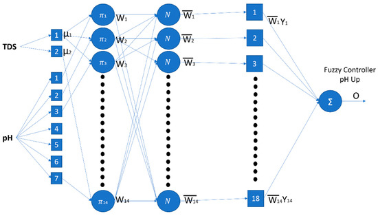 Figure 9. ANFIS pH Down structure. - For TDS Up model, it is a generalized bell membership function, with 5 degrees of membership function for TDS, as shown in Figure 10;