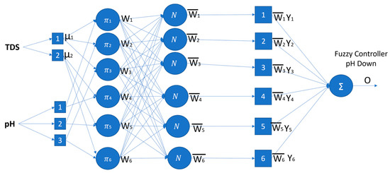 Figure 8. ANFIS pH Up structure. - For pH Down model, it is a generalized bell membership function, with 2 degrees of membership function for TDS and 3 degrees of membership function for pH, as shown in Figure 9;