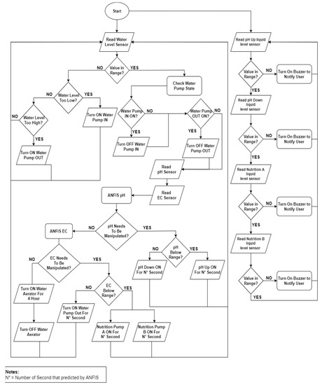 Figure 12 shows the system workflow. When the system runs, there will be two processes that run at the same time. The first process is the automatic hydroponic adjustment process. When the time shows that it is measurement time, the initial step is measuring the level of the water inside the reservoir. If the level does not reach the threshold, which is 10 liters, then it needs to be redetermined whether the water level is below the threshold or not. If it is below the determined level, then the water pump to add water into the reservoir will turn on to add water until the water level is at 10 L. Meanwhile, if the water level is not below the threshold, then a validation needs to be carried out again to confirm whether the water is above the threshold. If it is true, then the water pump coming out of the reservoir will turn on to reduce the water in the reservoir until the water level is at 10 L. If the water level is currently at 10 L, then there will be a validation to ensure the status of the water pump that adding water into the reservoir is already off. If the status is still on, then a trigger will be sent to turn the pump off, but if it is off, then there will be a validation sent to ensure the status of the water pump that the function of pumping water out of the reservoir is switched off. If the status is still on, then a trigger is sent to turn off the pump, and if it is off, then the process will continue to measure pH and TDS. Next, an order will be given to Arduino to perform the pH measurement process and TDS measurement process. The captured pH and TDS data will be input into the ANFIS pH model. If the computational results of ANFIS pH is not 0, then the pH needs to be manipulated by adding a pH Up liquid or adding a pH Down liquid until it produces an output result of 0. The next process is TDS evaluation, where the captured TDS data will be computed on the Raspberry based on the created model. If the computation result is not 0, then the dissolved nutrient level will be manipulated by adding nutrient liquids A and B or adding pure water to the reservoir. The process will be performed repeatedly until the computation result is 0.