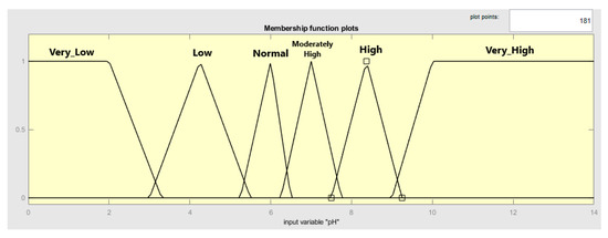 The next step is creating the fuzzy Sugeno. In fuzzy Sugeno, four fuzzy controllers will be made, fuzzy controller pH Up, fuzzy controller pH Down, fuzzy controller TDS UP, and fuzzy controller TDS Down. The first process is to define all degrees of the membership function for each fuzzy controller. According to research by Herman and Surantha [13], the degree of membership function is as shown in Figure 16, and pH can be categorized as follows:
