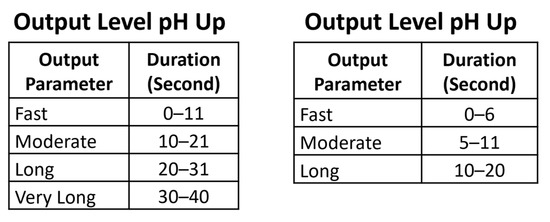 Then, the rules for each condition needs to be defined. Table 9 and Table 10 are knowledge bases for pH and as a guidance for each IF–Then statement. As for the output of fuzzy, which is in the form of how long the pH Up and pH Down need to turned on can be seen in Figure 18.