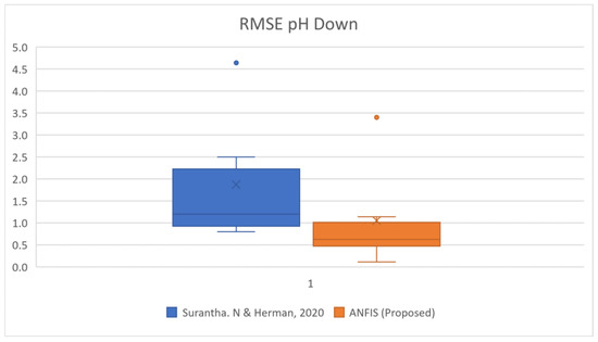 where forecast values is the output that is predicted by fuzzy Sugeno or fuzzy ANFIS, and observed values is the data that have been captured manually and used for the dataset. Referring to the RMSE box plots of all fuzzy controller models as shown in Figure 19, Figure 20, Figure 21 and Figure 22, it can be seen that the ANFIS fuzzy controller produces a smaller range and error rate than the Sugeno fuzzy controller. Furthermore, the percentage of improvement by using ANFIS instead of fuzzy Sugeno can be calculated by averaging all of the RMSE. The results can be seen in Table 12.
