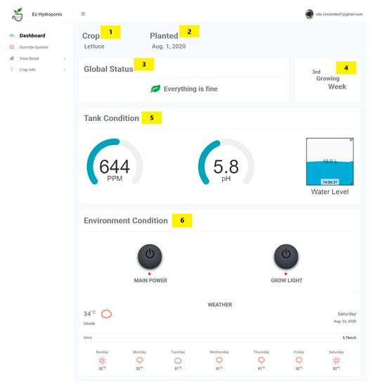 Figure 23 illustrates the dashboard smart hydroponic web app page. The IoT features can be obtained by using this web application. There are six pieces of information on this page: