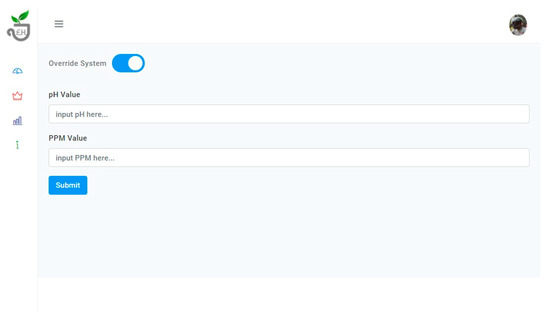 This system can also be manually operated by the users through the “Override System” menu, as can be seen in Figure 24. Users only need to turn on the feature, then fill in the desired pH and PPM values.