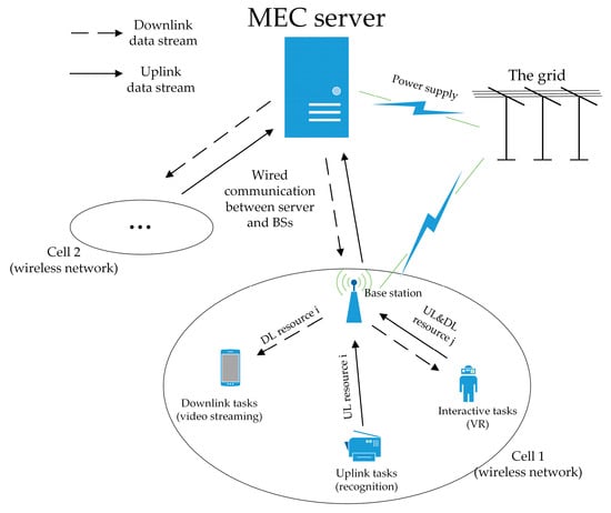 In most mobile networks, communication facilities are powered by the grid []. Compared with battery-powered user devices, these facilities are less sensitive to energy consumption during network working. However, for most user devices, the impact of energy consumption during the running of applications is critical. For example, if people had to carry a large-capacity power bank when using smart phones, the portability of mobile devices would be greatly reduced. Therefore, reducing the energy consumption of mobile devices when running computation-intensive apps is an important topic in current research []. In addition to the energy consumption of user devices, some 5G applications also have very strict requirements for delays in service delivery, for instance, telesurgery, automatic driving, VR [], etc. Obviously, a common requirement for these applications is to reduce the time required for application processing as much as possible. Generally, such applications require a large amount of computing power; thus, users’ mobile devices cannot independently complete the computation and analysis of massive data via local computing. Therefore, in order to solve a series of problems brought by the exponential growth in access and requirements of user devices [], and to improve network performance in scenarios where cloud computing is not applicable, researchers proposed mobile edge computing (MEC) in 5G scenarios a few years ago. So-called MEC allocates computing power close to users; at this time, user devices are only responsible for data transmission and result visualization.
