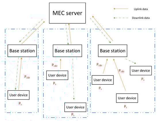 Based on the above sub-models, the overall model of the problem is shown in Figure 2. In the figure, Ps is the standby energy consumption and Pc&t represents computation and transmission energy consumption. Users in the blue dashed box are in the same cell.