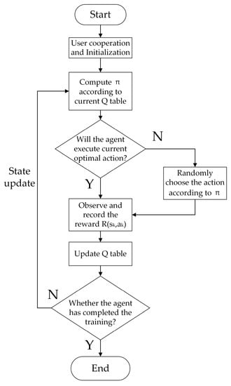 At the beginning of the algorithm, the MEC server needs to initialize the Q table and randomly select the initial state s0. After obtaining the network state sk, the server determines the optimal action by searching the maximum term of the current state in the Q table and calculates the strategy for action exploration. Whenever the MEC server searches the action, it will select the best action with a certain probability. At the same time, in order to ensure that the server always maintains exploration behavior during the learning process to avoid falling into local optimums, the MEC server will also select a random action according to the strategy π with another certain probability. After performing the selected action, the MEC server will obtain the reward based on the change in network performance. Finally, the next state sk+1 is determined according to the change in network state.