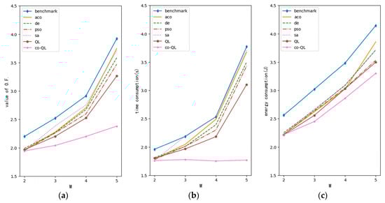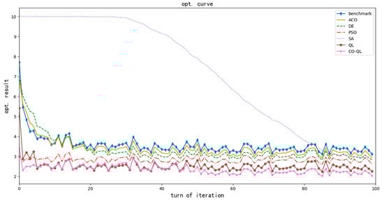 In the following figures, QL and co-QL represent the QL algorithm and QL with user cooperation considered, respectively. ACO, DE, PSO and SA denote the ant colony optimization algorithm, differential evolution algorithm, particle swarm optimization algorithm and simulated annealing algorithm, respectively. These heuristic algorithms were taken for comparison because they are typical and efficient. After continuous research and promotion, these algorithms have shown high efficiency and good performance in solving dynamic optimization problems [,,,]. Therefore, this simulation compared their performance with QL to illustrate the advantages of reinforcement learning compared with heuristic algorithms in solving dynamic optimization problems. The benchmark in the following figures is the result corresponding to the greedy algorithm with random exploration. This algorithm has the advantages of being simple and fast; however, it is easy to get trapped in a local optimal result.