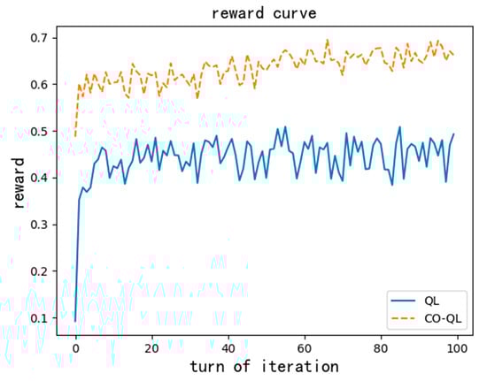 Figure 6 shows the reward curve of the two QL algorithms. The abscissa represents the iteration turn, and the ordinate is the average reward of the current turn. It can be seen that QL can realize a rapid increase in rewards and eventually converge on a stable result; thus, this algorithm is effective. In addition, from the above two figures, comparing the QL algorithms with and without user cooperation, the one with user cooperation had a better convergence performance. Since the number of tasks in the network is reduced by user cooperation during optimization, it is obvious that the QL with cooperation will obtain more rewards and converge on a better result than the one without cooperation.