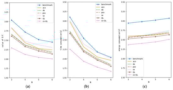 Optimization performance curve of variable N (M = 3, G = 1): (a) curve for value of objective function; (b) curve for time consumption; (c) curve for energy consumption.