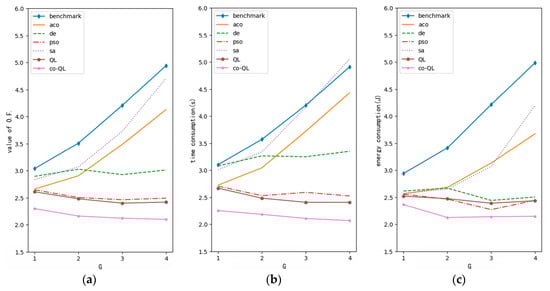 Optimization performance curve of variable G (M = 3, N = 3): (a) curve for value of objective function; (b) curve for time consumption; (c) curve for energy consumption.
