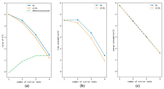 Performance curve of QLs with different task similarities (M = 4, N = 4, G = 1): (a) curve for value of objective function; (b) curve for time consumption; (c) curve for energy consumption.