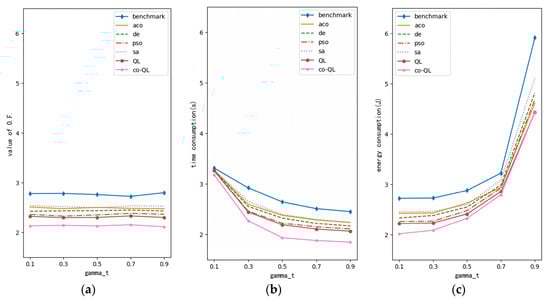 Optimization performance curve of variable γt (M = 3, N = 4, G = 1): (a) curve for value of objective function; (b) curve for time consumption; (c) curve for energy consumption.