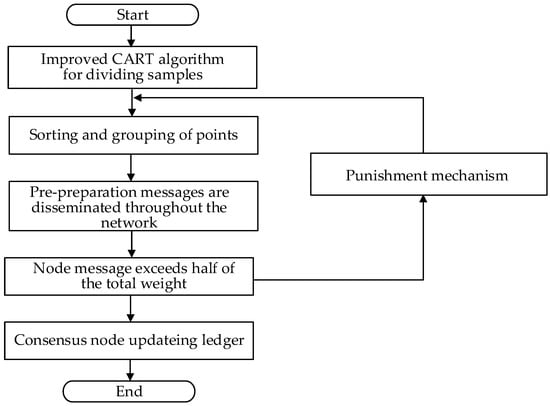 First, the sample is divided by weighting impurity variables, and the CART algorithm makes the nodes continuously subdivided. Secondly, a point-grouping mechanism is designed, with the weighted impurity variables of node attributes serving as the basis for scoring the initial points. All nodes will be assigned to consensus nodes, candidate nodes, or alternate nodes, and those with high points will become consensus nodes. Finally, when a network-wide message is published, the consensus node participates in consensus on behalf of all nodes and collects confirmation messages from other nodes. When the confirmation message reaches the voting threshold, the node updates the ledger and completes the consensus. When the confirmation message does not reach the voting threshold, the errant node is dealt with through a penalty mechanism, and a new consensus node is elected for consensus.
