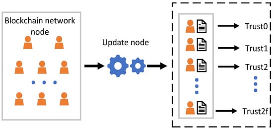 As shown in Figure 2, the nodes are sorted using the point mechanism, and the nodes with high trust degree have 2f + 1, in the order of {0, …, 2f} from high to low according to the consensus node number. The first N is selected as the master node from the node with a high trust degree, and the master node is chosen with points as the reference standard to ensure the stability of the master node.