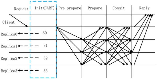 As shown in Figure 3, the C-PBFT algorithm consists of four parts: the initialization phase, the pre-preparation phase, the preparation phase, and the submission phase. The C-PBFT algorithm maintains the initial three-stage step but adds an initialization process before the three-stage protocol. Since the number of all consensus nodes is fixed during the operation of the PBFT consensus algorithm, there is no support for nodes to join or exit freely. Therefore, the initialization phase only starts when a new node joins or an old node exits.
