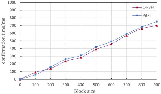 The transaction delay of the C-PBFT and PBFT algorithm increases with the increase in block size. The bandwidth of the blockchain network remains unchanged, but the volume of requested transactions increases, and the times for broadcasting and hashing of consensus node messages are extended. The transaction time in the optimized PBFT algorithm will be slightly lower than that in the traditional PBFT consensus algorithm. Although PBFT and C-PBFT algorithms require three stages to complete the consensus, the optimization algorithm introduces voting weights to complete the distributed consensus. Consensus is reached through a small number of consensus nodes with high points to improve the operational efficiency of the system.